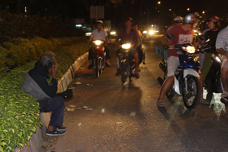 Một người đàn ông ngả nón xin tiền ở ngã tư đường Trường Chinh giao với Cộng Hòa, quận Tân Bình tối 23-2. Khi thấy ống kính chĩa vào, người đàn ông vội lấy tay che mặt. Ảnh HOÀNG LAN