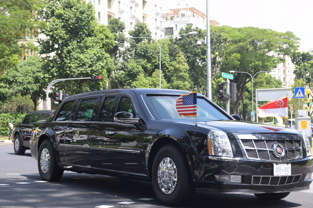 Siêu xe The Beast chở ông Trump rời khỏi khách sạn Shangri-La. Ảnh: Straits Times