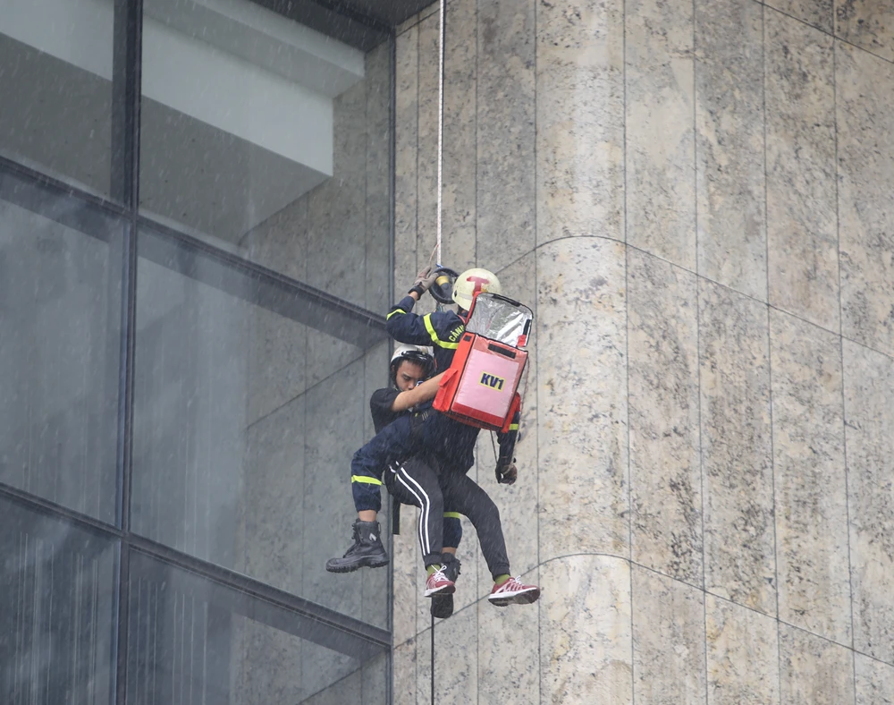 Lực lượng cảnh sát PCCC và CNCH đu dây đưa người bị nạn xuống.