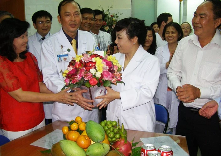 Bộ trưởng Bộ Y tế nhận lẳng hoa xuân từ phía BV Từ Dũ.