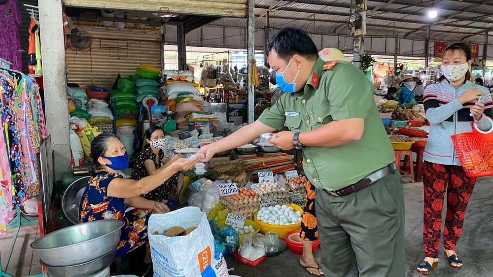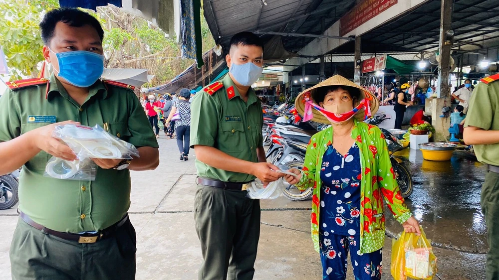 Công an Cần Thơ tặng khẩu trang cho tiểu thương ở chợ địa bàn Bình Thủy. Ảnh: HẢI DƯƠNG