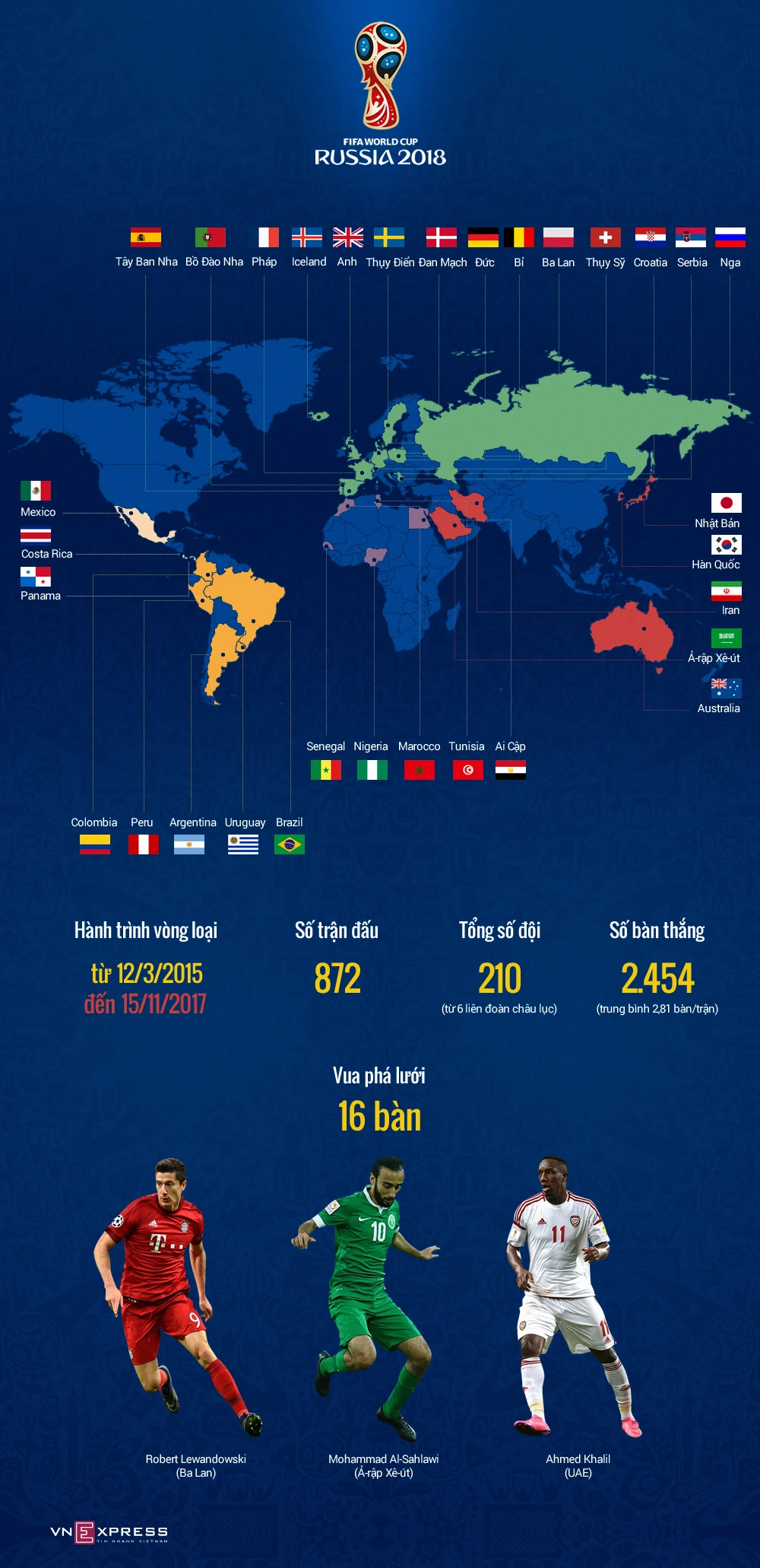 Trải qua hai năm rưỡi tranh tài, với gần 900 trận đấu, vòng loại World Cup 2018 đã xác định được 32 anh tài dự ngày hội lớn tại Nga hè sang năm.