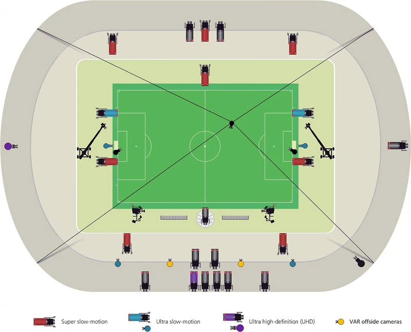 Số lượng camera để phục vụ VAR trước giờ những nhà làm bóng đá Việt Nam cứ nghĩ đơn giản là xuất hình từ bộ phận truyền hình trực tiếp trên sân nhưng thực tế là một bộ phận với 33 camera ghi hình riêng biệt chỉ để phục vụ cho VAR. Trong 33 camera trên có tám camera siêu chậm (super slow motion) và bốn camera quay chậm cực đại (ultra slow motion). Còn lại là các camera bắt hình với tốc độ bình thường nhưng phải đảm bảo độ phân giải cao.