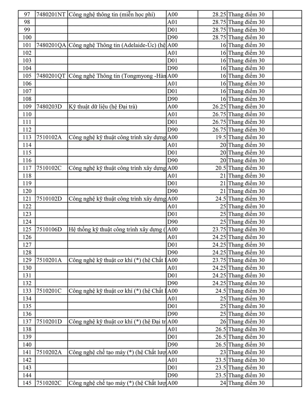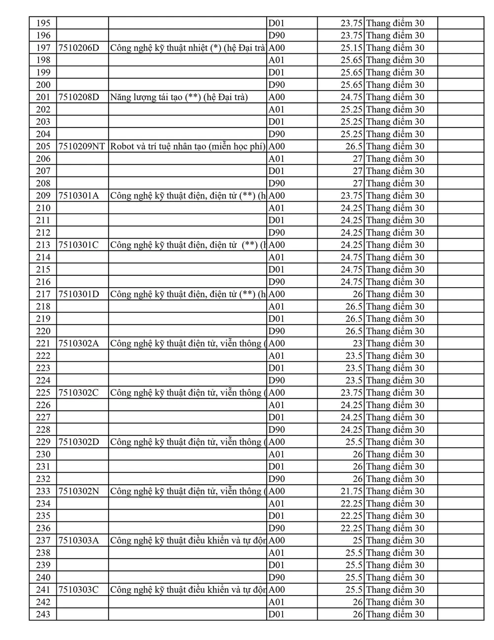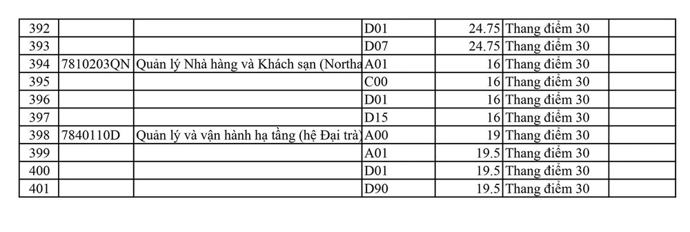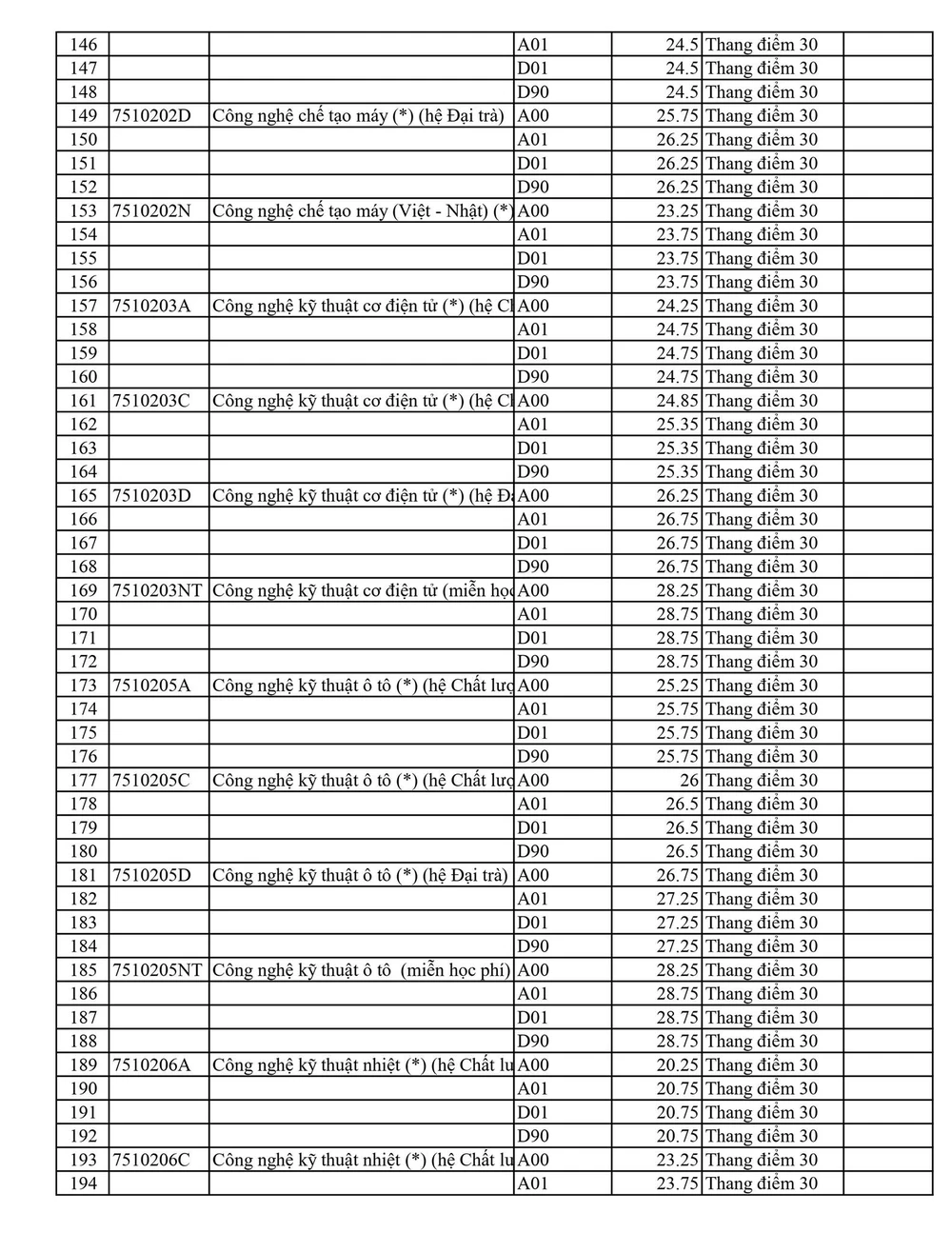Trong đó, cao nhất là Sư phạm tiếng Anh với 27,25 điểm, Ô tô hệ đại trà và Công nghệ thông tin (đại trà) là 26,75 điểm. Các ngành khác ở hệ đại trà như Nhiệt, Tự động hóa, Công nghệ kỹ thuật máy tính,…đều có mức điểm trên 25.