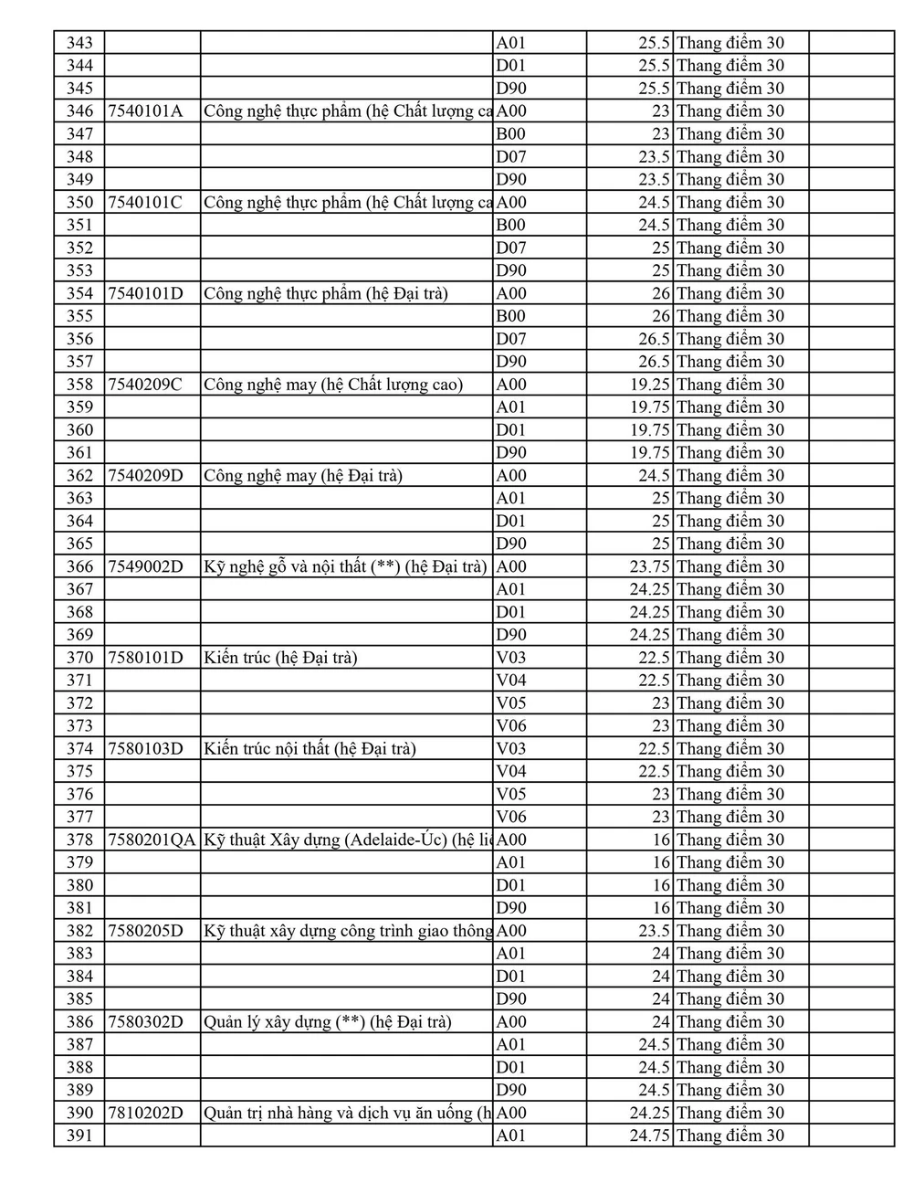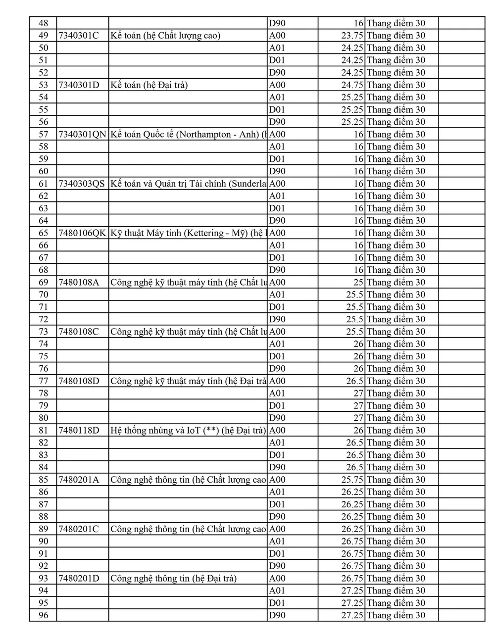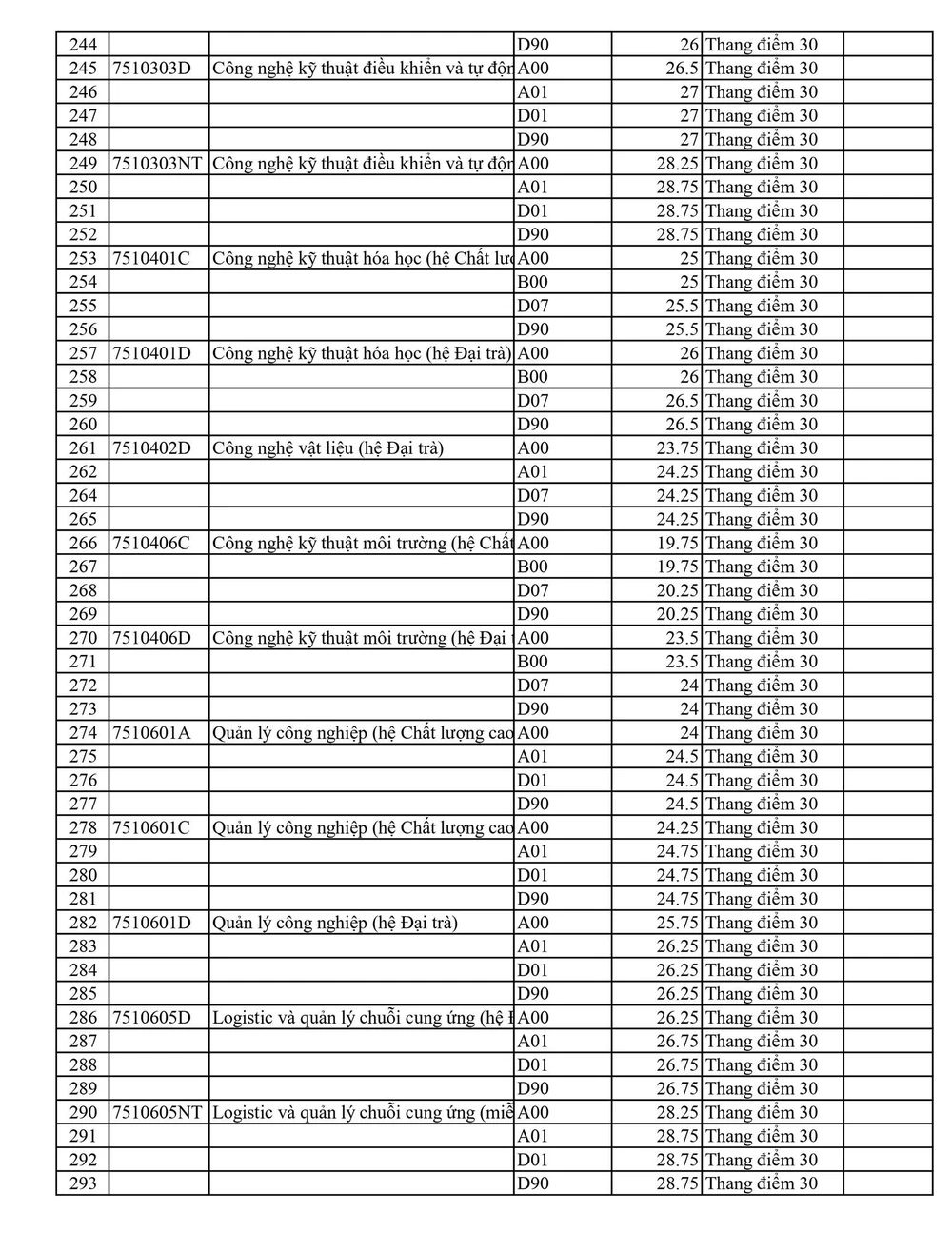 Trong đó, cao nhất là Sư phạm tiếng Anh với 27,25 điểm, Ô tô hệ đại trà và Công nghệ thông tin (đại trà) là 26,75 điểm. Các ngành khác ở hệ đại trà như Nhiệt, Tự động hóa, Công nghệ kỹ thuật máy tính,…đều có mức điểm trên 25.
