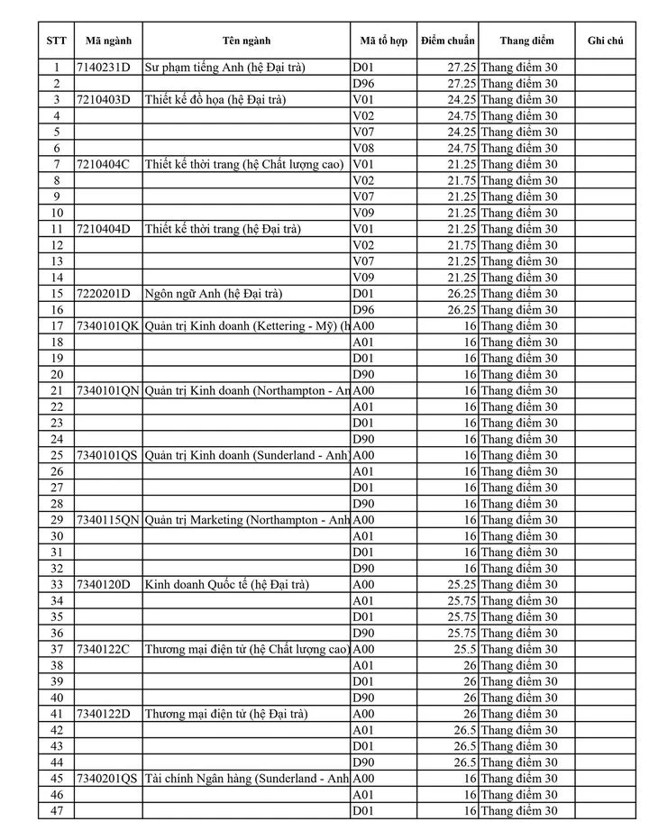 Các ngành còn lại cũng có điểm chuẩn từ 16 đến 25 điểm.