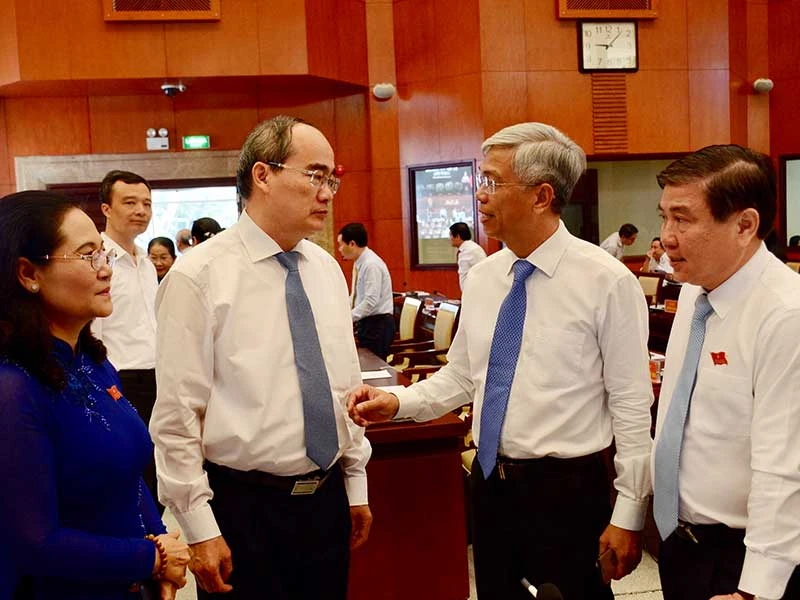 Bí thư Thành ủy Nguyễn Thiện Nhân trao đổi với các đại biểu tại kỳ họp bất thường HĐND TP.HCM ngày 6-10. Ảnh: TL