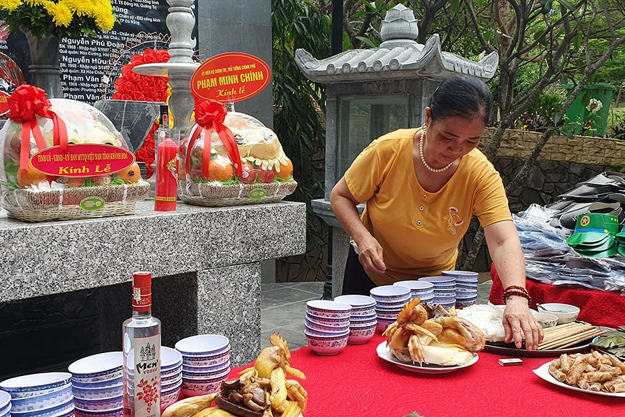 Bà Nguyễn Thị Hường, chị liệt sĩ Nguyễn Tất Nam, chăm chút lễ cúng các liệt sĩ. Ảnh: TẤN LỘC