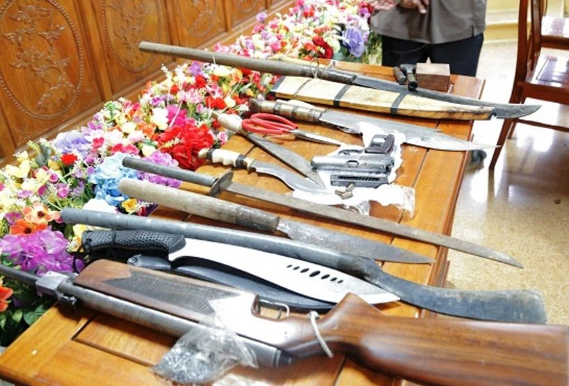 Tang vật súng cùng các hung khí công an thu giữ tại "ổ bạc".