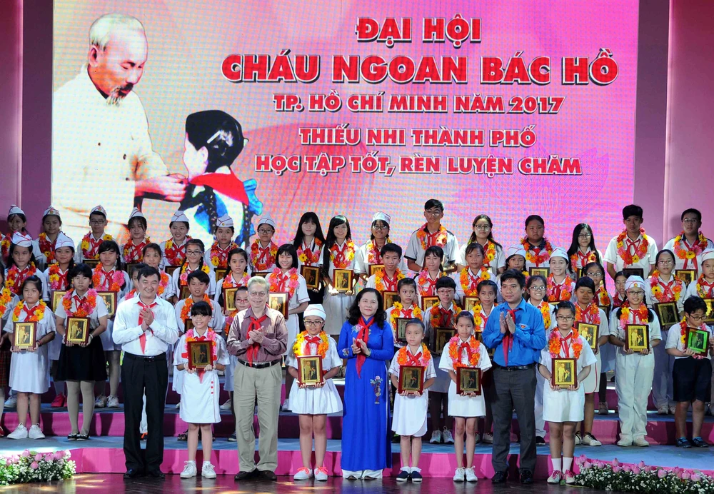 Chiều cùng ngày, tại hội trường nhà thiếu nhi TP.HCM, các đại biểu đã cùng tham dự lễ tuyên dương Cháu ngoan Bác Hồ TP năm 2017 - chủ đề "Thiếu nhi TP học tập tốt, rèn luyện chăm".