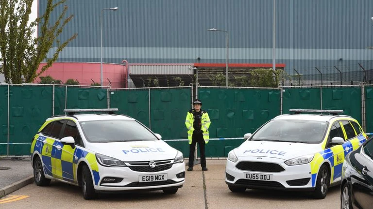 Cảnh sát canh giữ nghiêm ngặt khu vực phát hiện container chở 39 thi thể. Ảnh: NEWS SKY