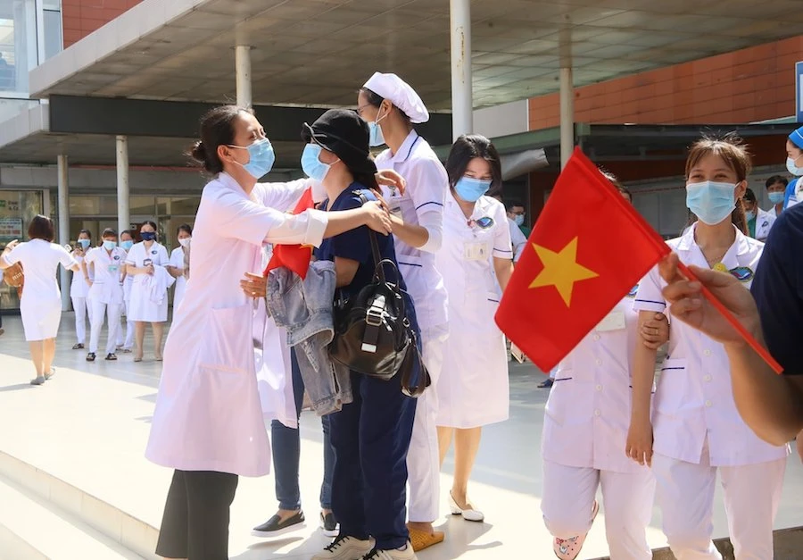 Các y, bác sĩ chia tay người thân trước khi lên đường.