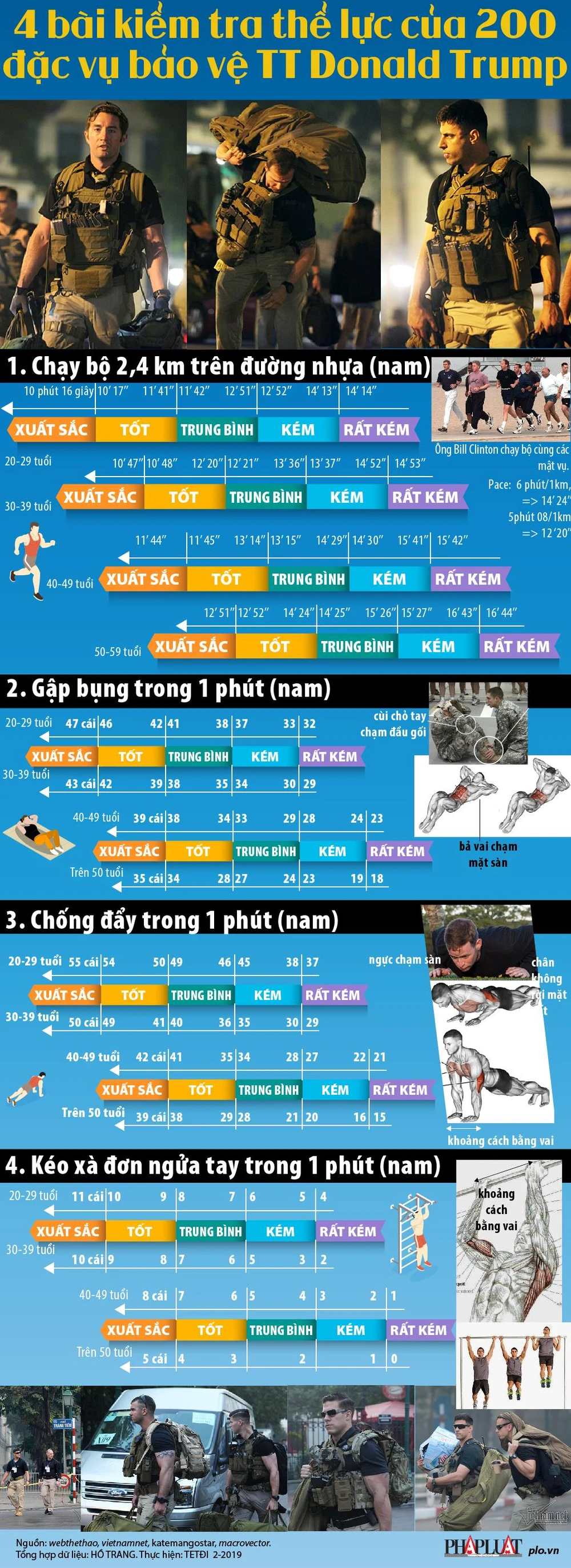 (PLO)- Hơn 200 nhân viên đặc vụ "hầm hố" như phim hành động Mỹ đã có mặt ở Hà Nội để đảm bảo an ninh cho Tổng thống Donald Trump trong hội nghị thượng đỉnh Mỹ - Triều tháng 2-2019. Muốn làm vị trí này, người nộp đơn vào Cơ quan mật vụ Mỹ phải đạt bốn bài kiểm tra thể lực cơ bản gồm: chống đẩy, gập bụng, kéo xà đơn, chạy bộ 1,5 dặm (~ 2,4km).