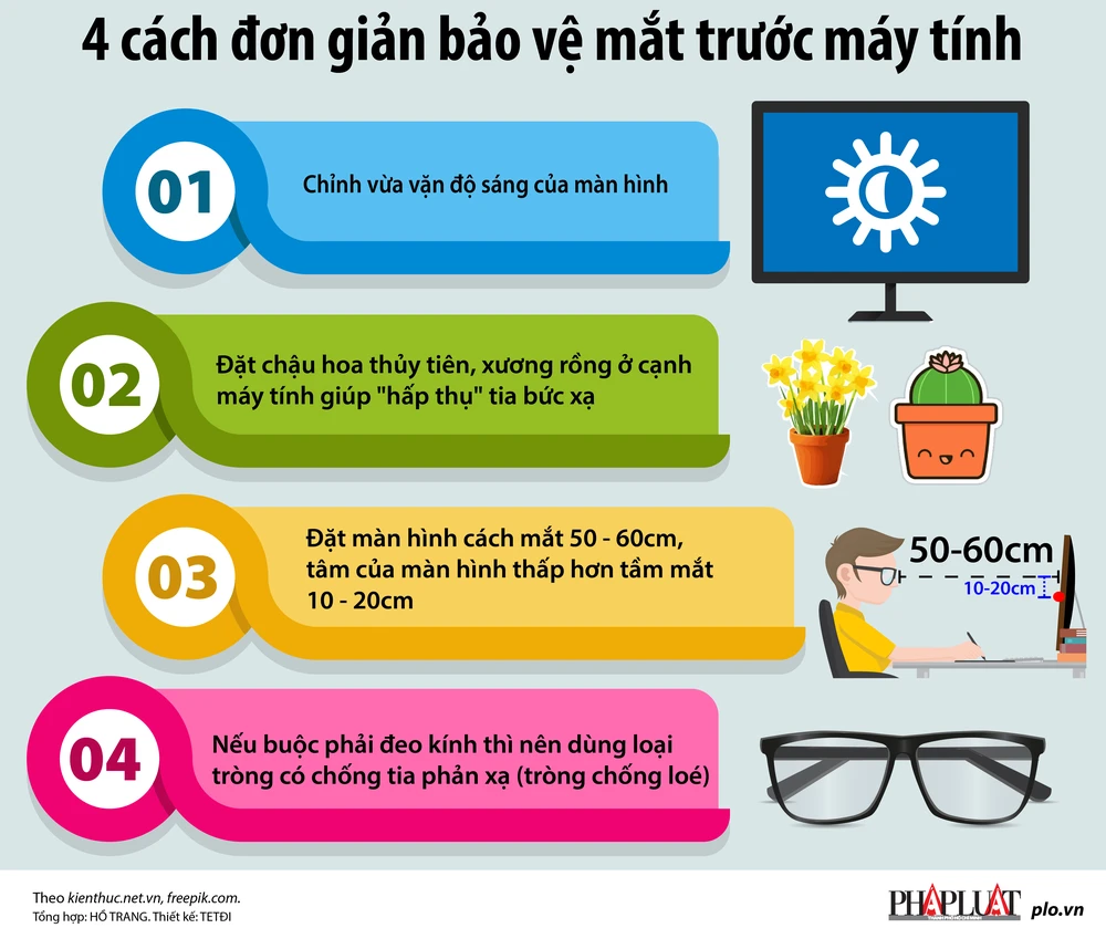 (PLO) - Xung quanh máy tính và các thiết bị điện đều có bức xạ điện từ gây ảnh hưởng không tốt lên cơ thể, đặc biệt là mắt. Người tiếp xúc với máy tính nhiều có thể áp dụng bốn cách đơn giản sau để bảo vệ mắt.