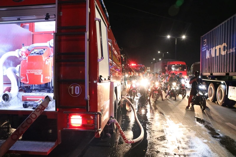 Đám cháy xảy ra trên tuyến đường giao thông huyết mạch đúng vào giờ cao điểm gây kẹt xe nghiêm trọng
