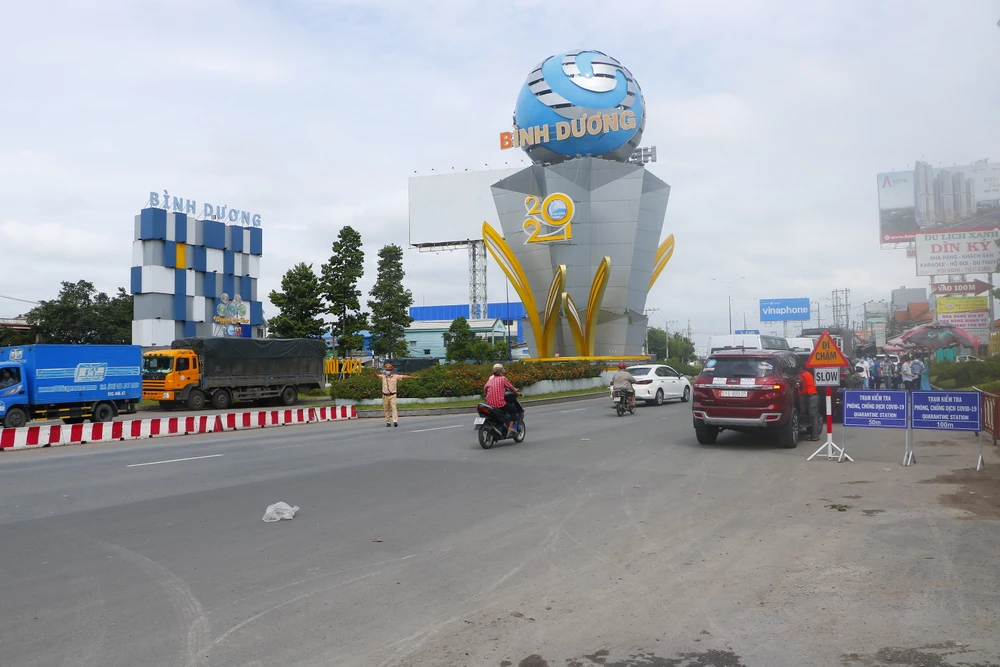 Chiến sĩ CSGT kiểm soát các phương tiện vào Bình Dương trên quốc lộ 13 (cầu Vĩnh Bình). Ảnh: LÊ ÁNH