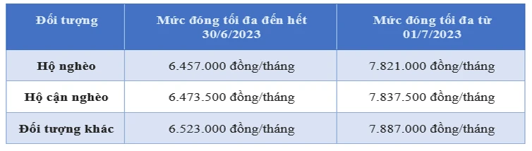 Mức đóng thấp nhất = Mức chuẩn hộ nghèo khu vực nông thôn = 1,5 triệu đồng; Mức đóng cao nhất = 20 x Mức lương cơ sở.