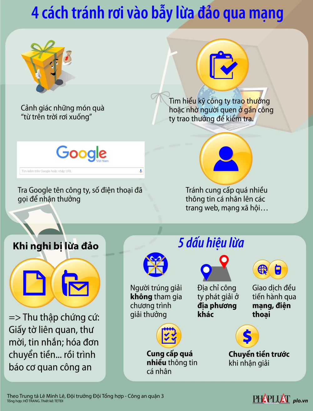 (PLO) - Thời gian gần đây xuất hiện tình trạng bị một số tài khoản Facebook nhắn tin, thông báo trúng thưởng xe SH, điện thoại iPhone, phiếu mua hàng… để lừa chiếm đoạt hàng chục triệu đồng. Trung tá Lê Minh Lê, Đội trưởng Đội Tổng hợp - Công an quận 3 có những lưu ý để không bị lừa đảo qua mạng.
