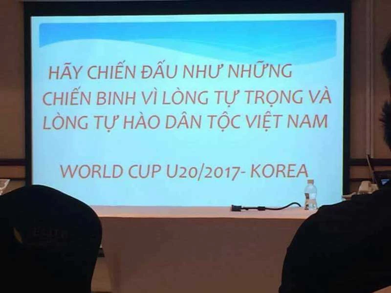 Cầu thủ Quang Hải thay mặt toàn đội U-19 Việt Nam hứa với các thầy rằng mình và đồng đội sẽ chơi nỗ lực hơn sức mình để tri ân người yêu bóng đá. Có một chi tiết thú vị trong cuộc họp cuối, HLV Hoàng Anh Tuấn bất ngờ cho chiếu lên màn hình dòng chữ: “Hãy chiến đấu như những chiến binh vì lòng tự trọng và tự hào dân tộc Việt Nam”. Phía dưới lời hiệu triệu ấy, ông thầy người Khánh Hòa còn lên dây cót tinh thần cho học trò bằng câu kết: “World Cup U-20/2017 - Korea”.