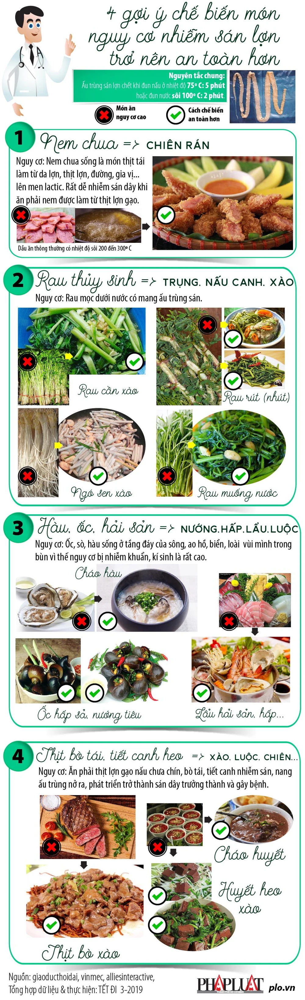 (PLO)- Cùng một loại thực phẩm nguyên liệu như nem chua, thịt bò tái, huyết heo, rau thủy sinh,... có nguy cơ cao nhiễm sán lợn, nếu ta tuân thủ nguyên tắc chung khi chế biến như dưới đây sẽ đảm bảo an toàn vệ sinh.