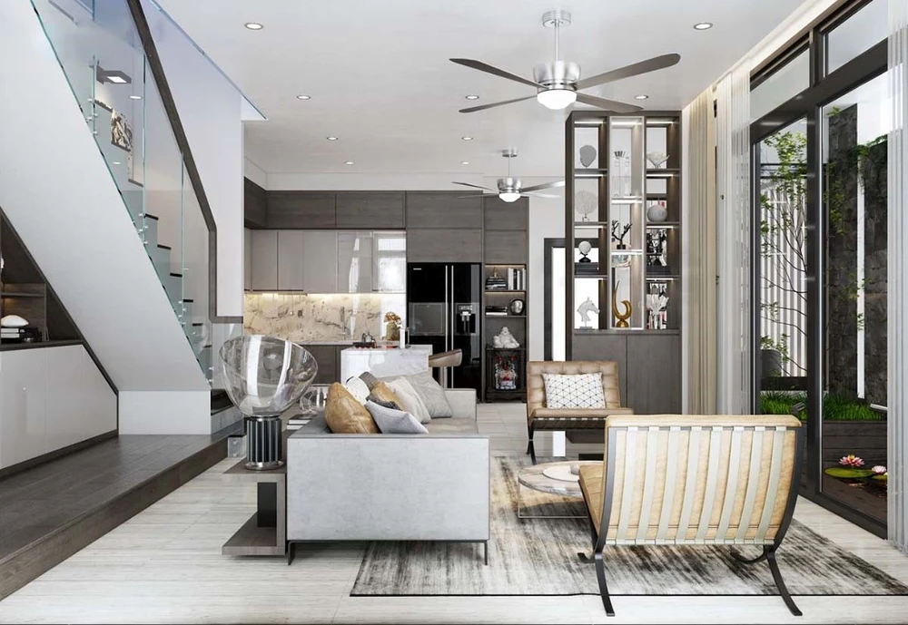 Nội thất phòng khách liền bếp hiện đại cho nhà phố rộng rãi, thoải mái