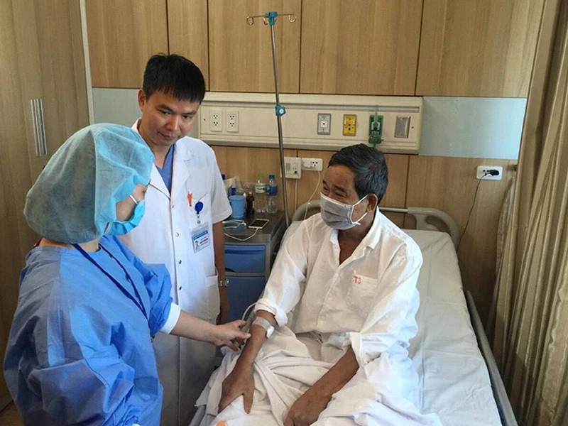 PGS-TS-BS Nguyễn Quang Nghĩa, Giám đốc Trung tâm Ghép tạng thuộc BV Việt Đức (giữa), đang thăm khám cho một bệnh nhân ghép tạng. Ảnh: HP