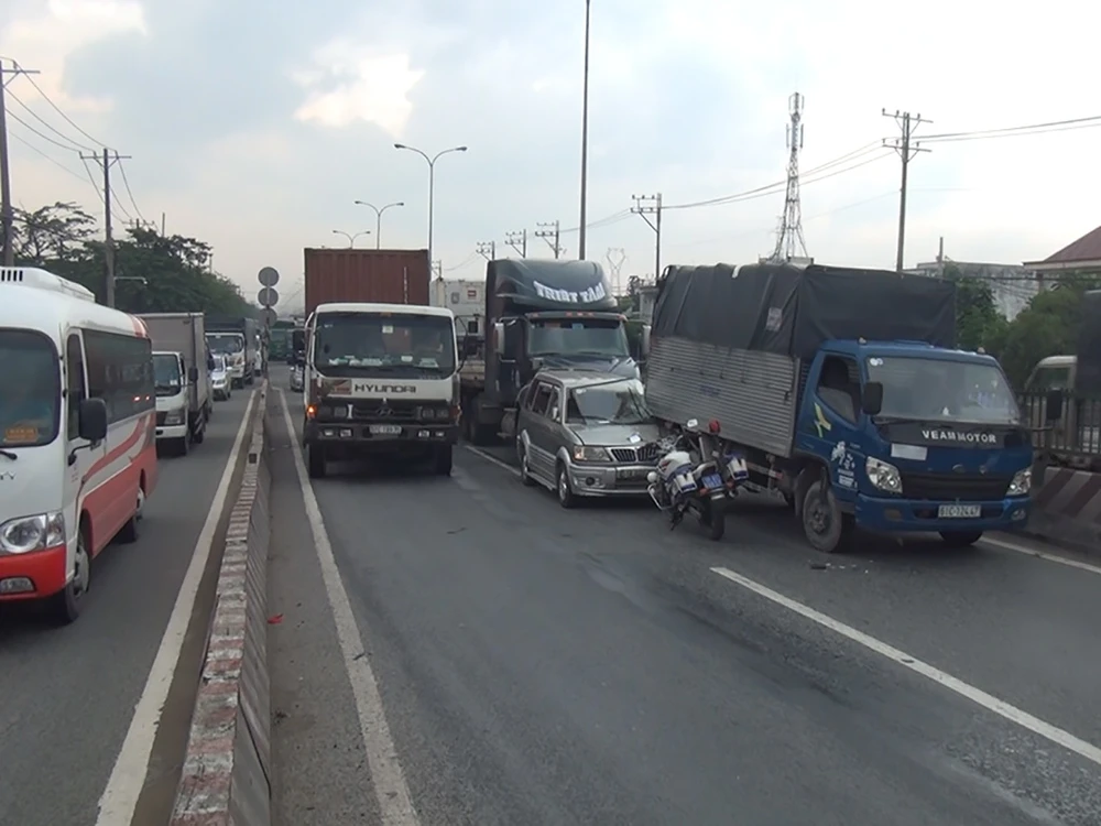 Thông tin ban đầu, chiều 11-10, ô tô bảy chỗ biển số 51A… đang dừng đậu chờ đèn đỏ trên dốc cầu Bình Thuận (quận Bình Tân, TP.HCM) thì bất ngờ bị xe container biển số 51C… chạy hướng từ An Lạc về An Sương đến đã húc mạnh vào đuôi.