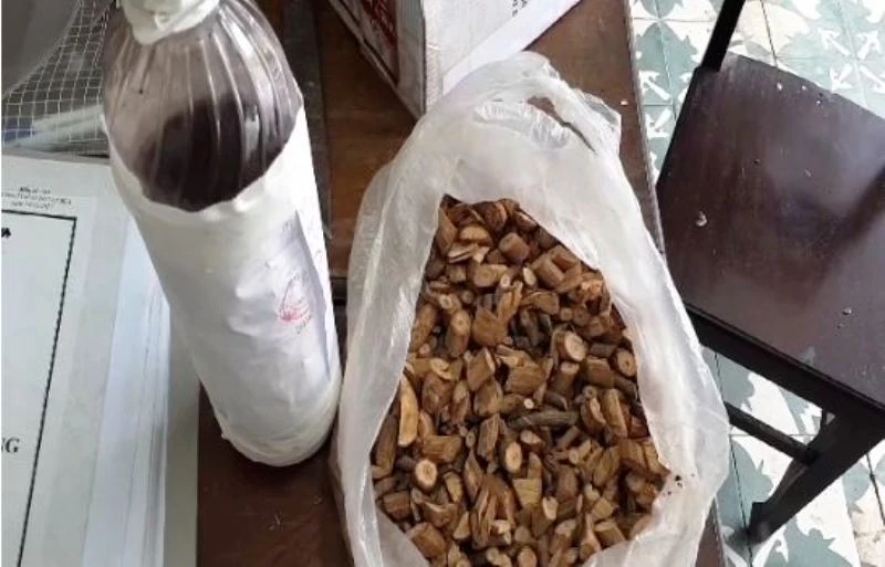 Chiều 13-3, Cơ quan Công an huyện miền núi Kỳ Sơn (Nghệ An) đã thu giữ chai rượu ngâm rễ cây uống chưa hết, bốn chiếc cốc uống rượu và một bịch cành, rễ cây rừng khô, được thu giữ tại nhà vợ chồng anh Moong Văn Đi (40 tuổi), chị Lô Thị Văn (39 tuổi, trú xã Hữu Lập, huyện Kỳ Sơn).