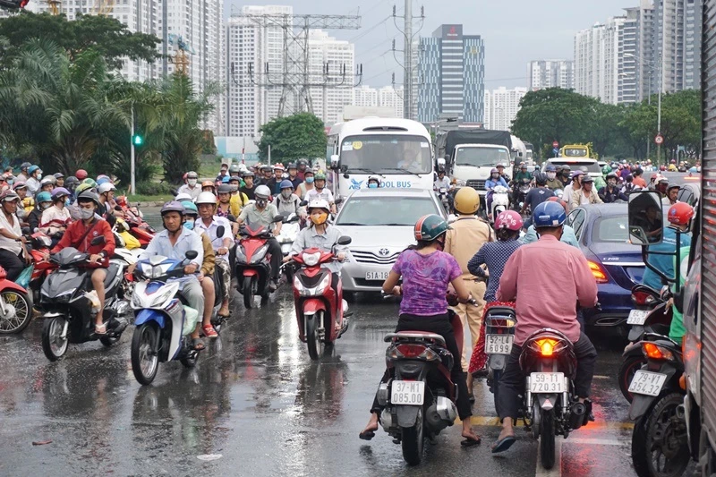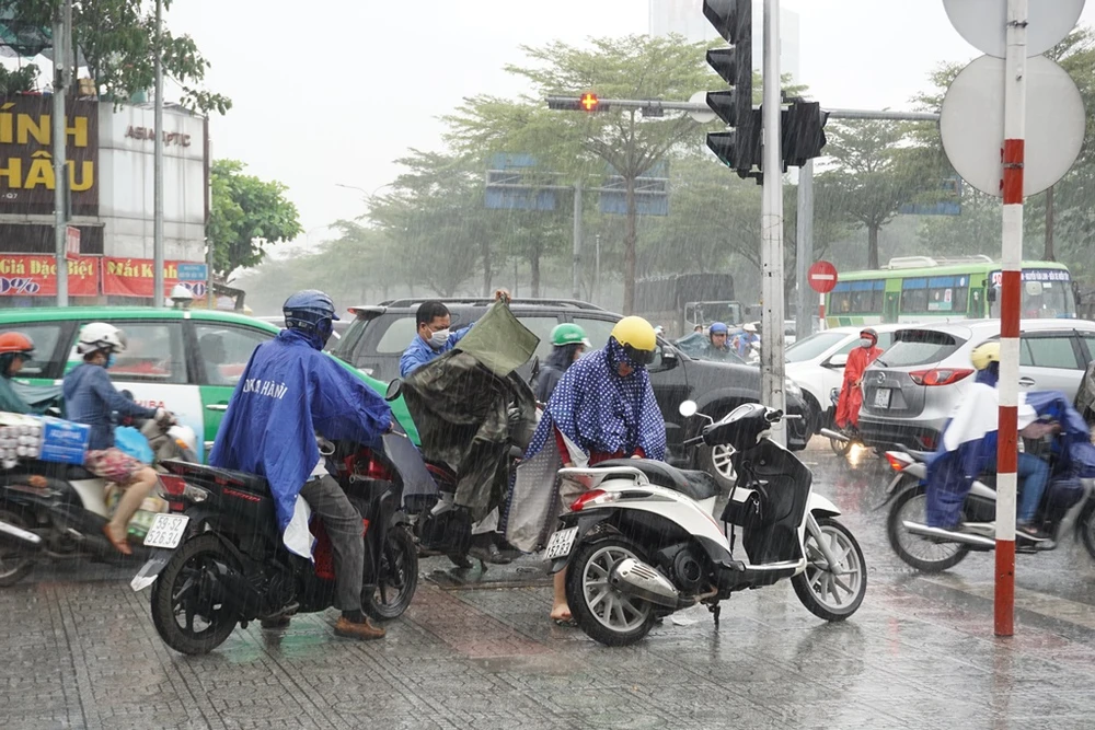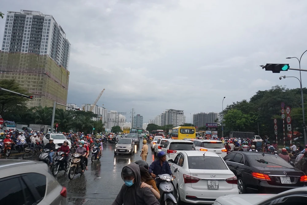 Khi cơn mưa vừa trút xuống, nhiều người dừng lại mặc áo mưa khiến tình trạng kẹt xe nghiêm trọng hơn.