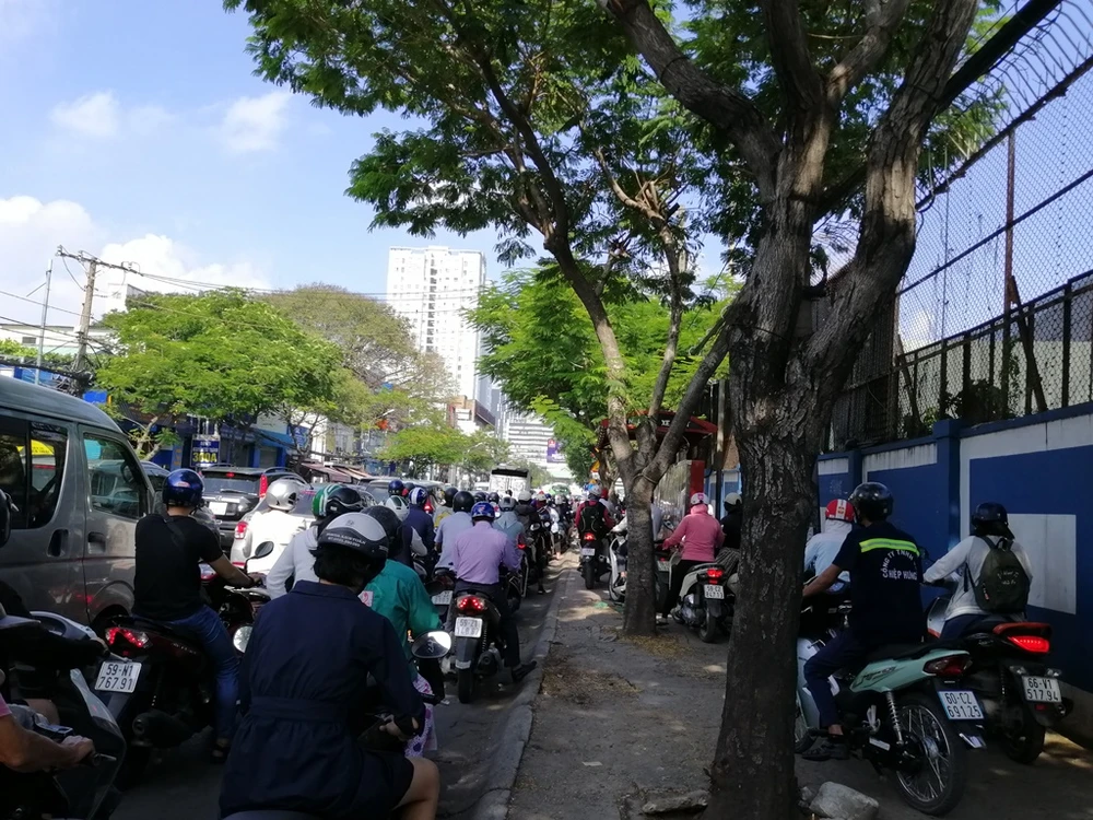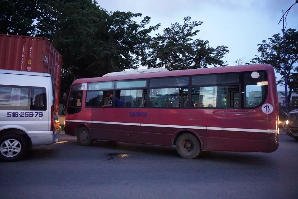Tương tự tại chân cầu Khánh Hội, đường Nguyễn Tất Thành (quận 4) vào 9 giờ sáng 1-11, xe khách ra vào khu vực Bảo tàng Hồ Chí Minh thường xuyên khiến các phương tiện khác bị kẹt lại. Xe máy leo lề, ô tô phải ngừng di chuyển.