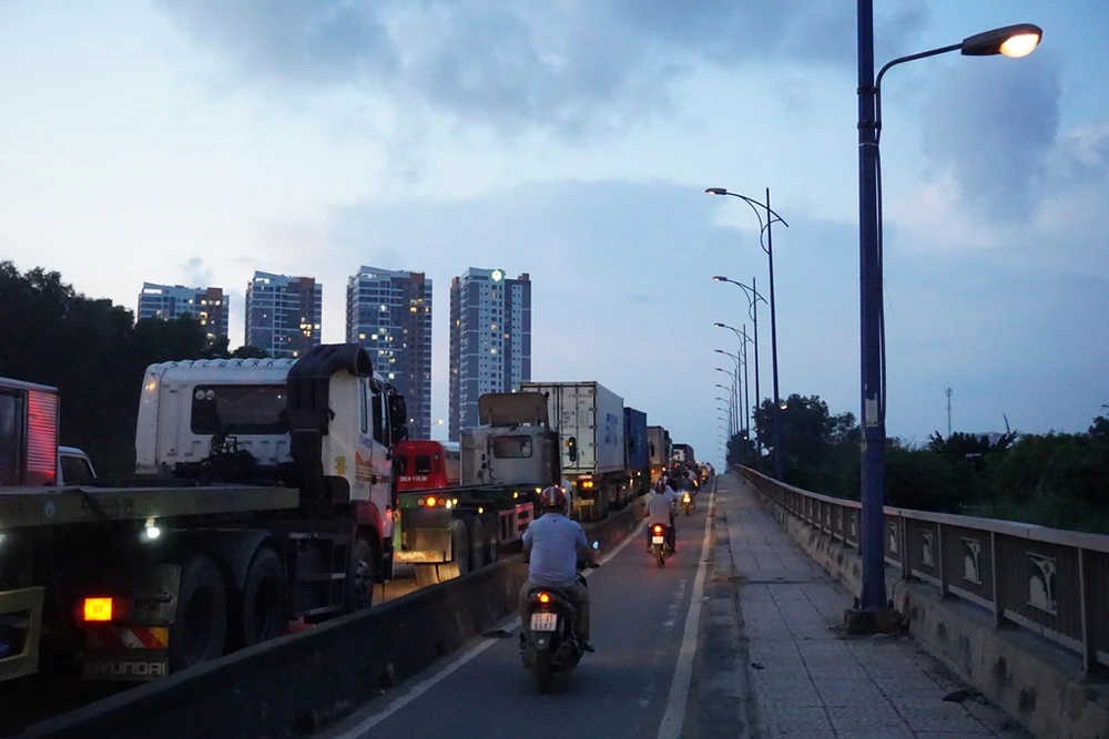 Dù không có sự cố giao thông nhưng các xe vẫn phải xếp hàng chen nhau qua cầu Rạch Đĩa 2.