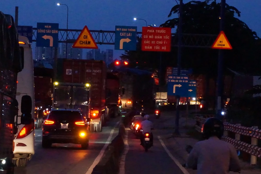 Container xếp hàng dài chờ đợi từ hướng Đồng Văn Cống-Mai Chí Thọ.