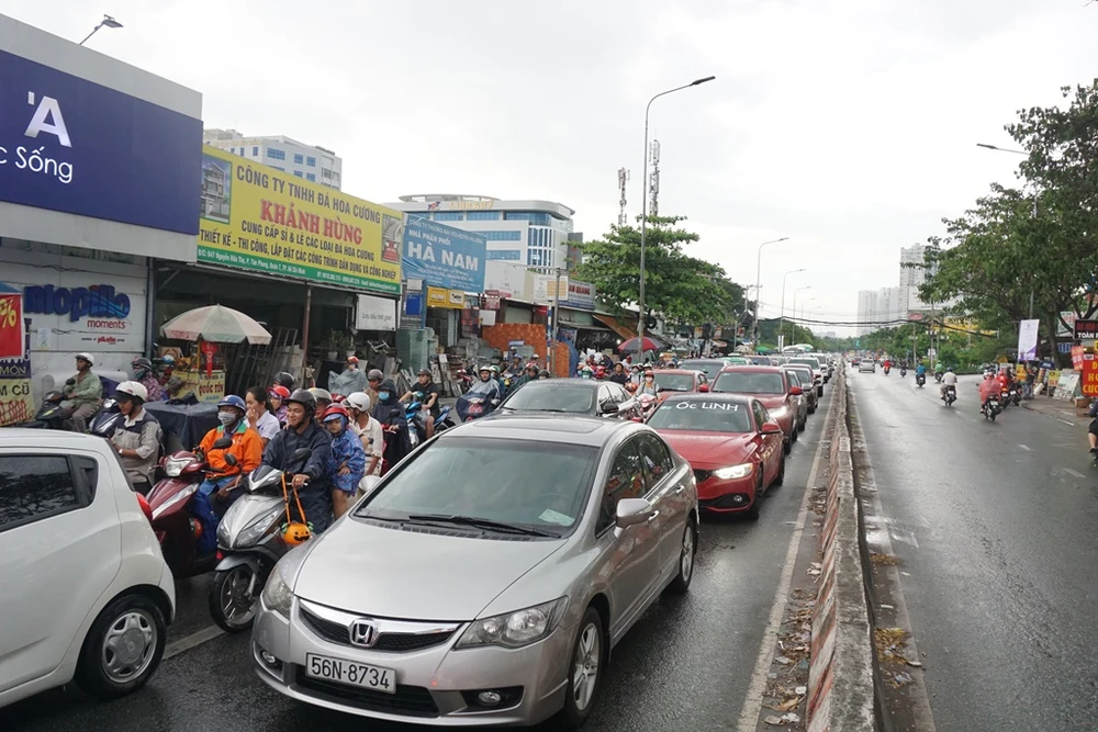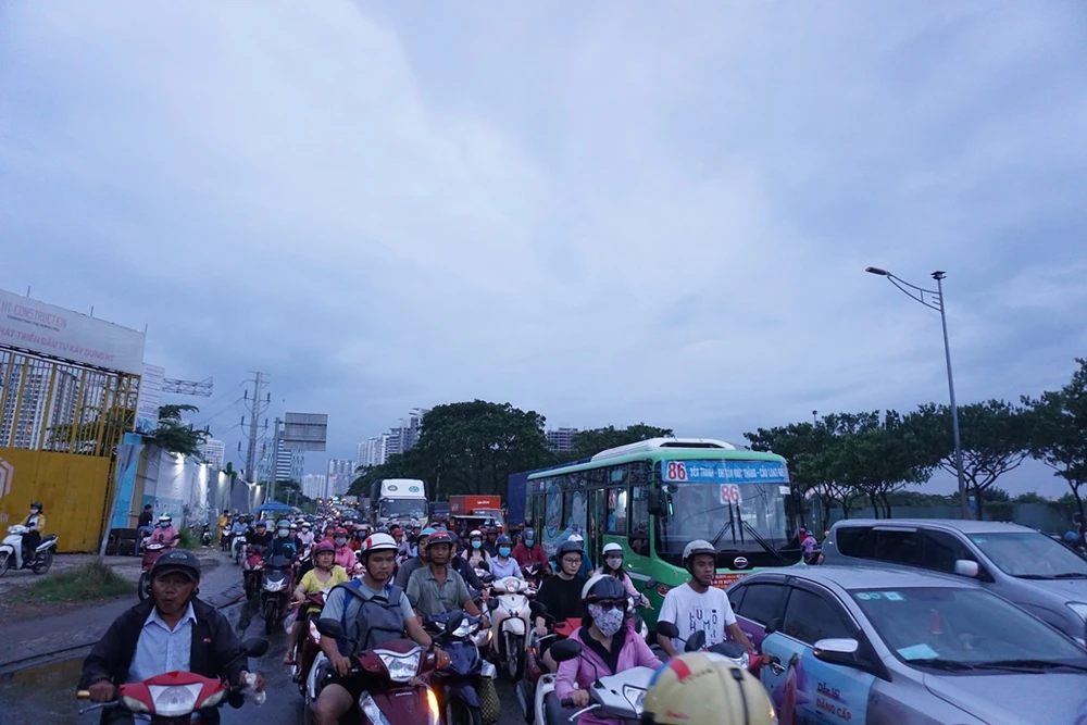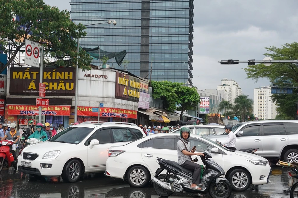 Ở cửa ngõ phía Nam, vào giờ tan tầm, tại giao lộ Nguyễn Hữu Thọ-Nguyễn Văn Linh (quận 7), nhiều ô tô, xe máy rời trung tâm TP về hướng quận 7 phải nhích từng chút một. Nguyên nhân là do lượng xe lớn từ đường Nguyễn Hữu Thọ, cầu Rạch Đĩa 2 và phương tiện lưu thông trên đường Nguyễn Văn Linh dồn về cùng lúc.