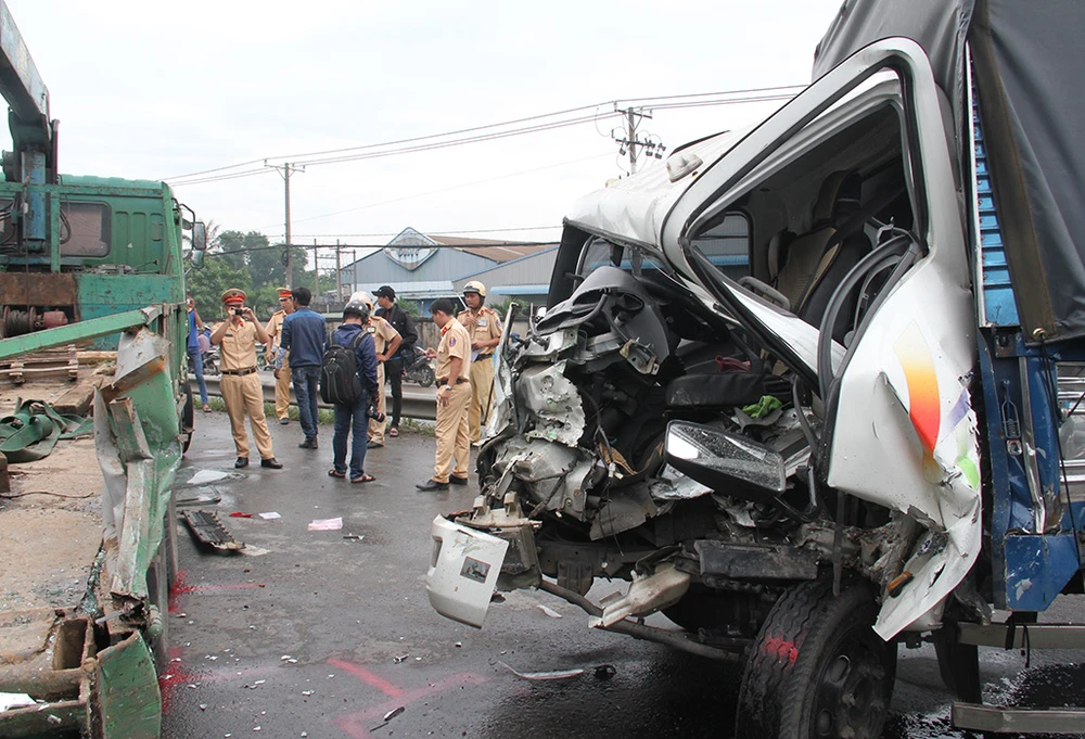 Theo tài xế, do trời mưa, phương tiện phía trước đột ngột giảm tốc độ nên anh phải bẻ lái tránh đồng thời thắng gấp. Đúng lúc xe tải cẩu biển số 60C… lưu thông cùng chiều phía sau không xử lý kịp đã tông thẳng vào đuôi.