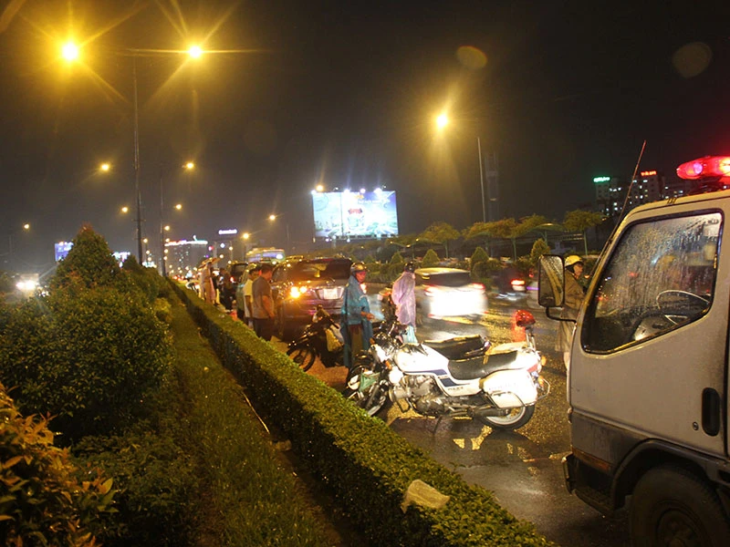 Khi đến giữa cầu Tham Lương (ranh giới giữa quận Tân Bình và quận 12, TP.HCM) người này phát hiện phía trước đang kẹt xe nên giảm tốc độ thì va chạm với xe ô tô biển số Đà Nẵng do người đàn ông khoảng 40 tuổi điều khiển.