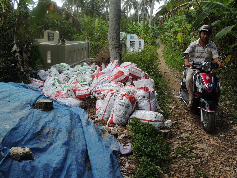 Bốn tấn gia vị nêm quá hạn sử dụng, được nông dân ở huyện Cái Bè (Tiền Giang) thu gom vô bao chở về làm phân bón cây - ảnh T.PHÚC