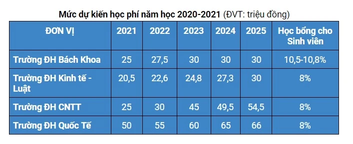 Được biết, trước đó, bốn trường ĐH này đã xây dựng lộ trình áp dụng học phí dự kiến mới từ năm 2021 đến năm 2025. Mức trung bình dự kiến từ 20,5 đến 66 triệu đồng/năm, tức sẽ tăng gấp 2-3 lần so với hiện tại để đảm bảo định mức kinh tế - kỹ thuật và chi phí dịch vụ giáo dục đào tạo.