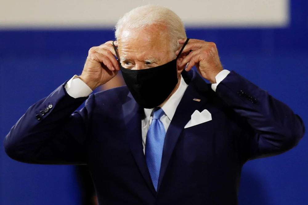 Ông Biden đeo khẩu trang khi xuất hiện trước cử tri TP Wilmington, bang Delaware (Mỹ) ngày 12-8. Ảnh: REUTERS
