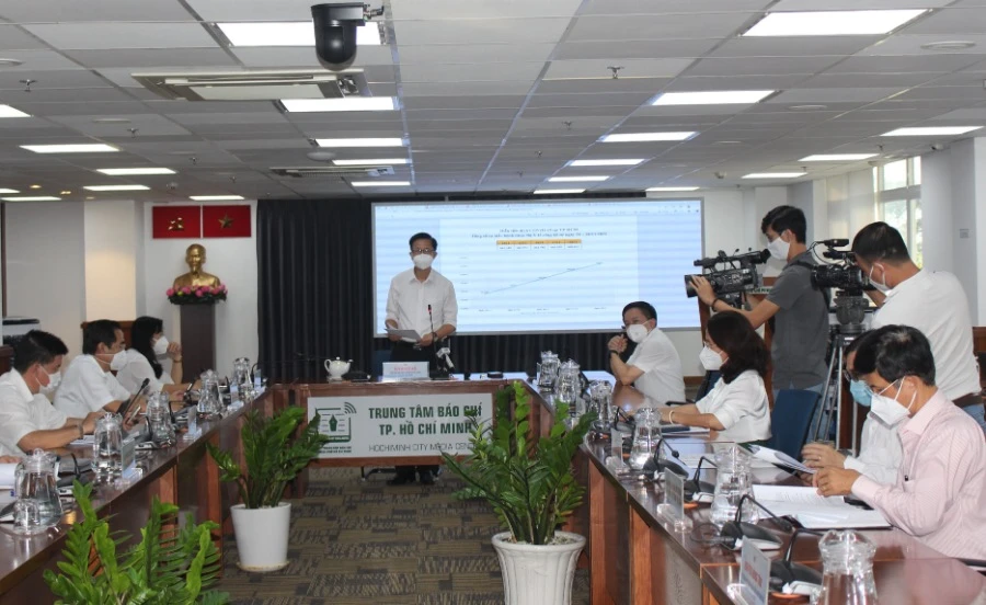Ông Phạm Đức Hải, Phó trưởng Ban Chỉ đạo phòng chống dịch COVID-19 TP.HCM thông tin tại họp báo. Ảnh: TÁ LÂM