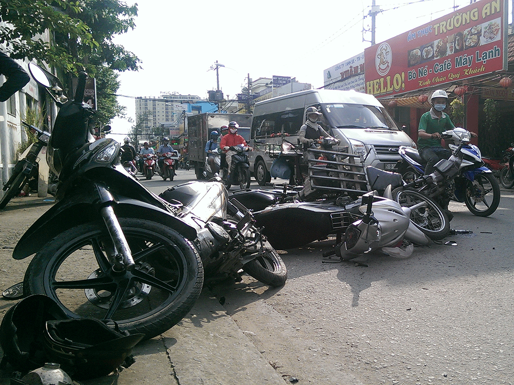 Bốn xe máy tông liên hoàn trên đường Phan Huy Ích khiến nhiều người bị thương. Ảnh: H.TÂM