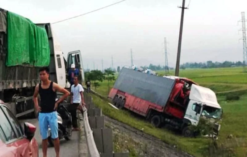 Tại hiện trường, chiếc xe container và xe tải đâm nhau khiến xe tải lật nằm ngang đường, một xe tải khác đâm vào đuôi xe container bị hư hỏng nặng. Chiếc đầu kéo đăng ký ở Hà Nội kéo theo rơ moóc chở nhiều thiết bị máy nông nghiệp đã đâm gãy dải hộ lan đường, lao xuống ruộng.