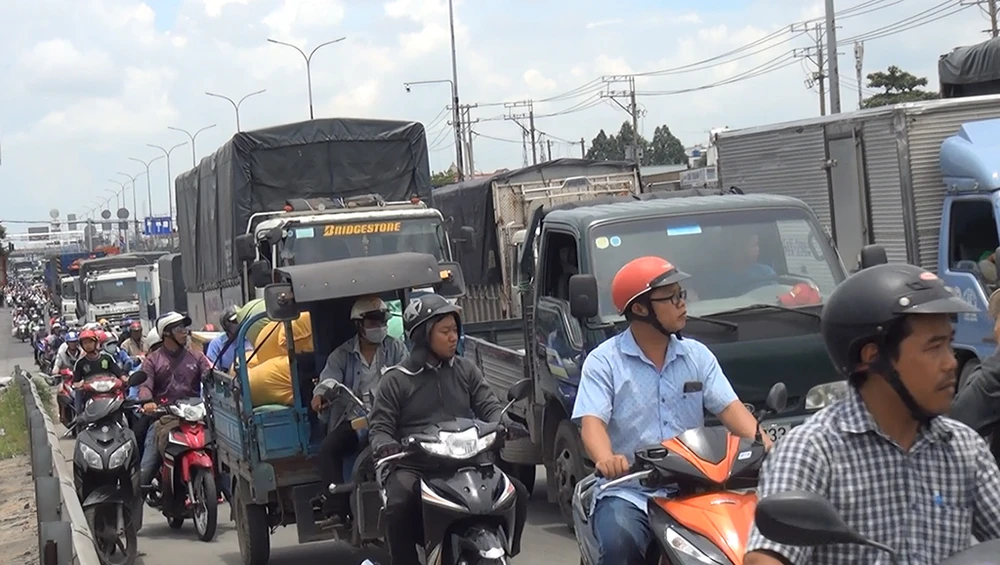 Tại hiện trường, ba xe còn lại nằm choán một làn đường đúng thời điểm hàng ngàn phương tiện đang rời TP.HCM về miền Tây khiến giao thông ùn ứ nhiều km.