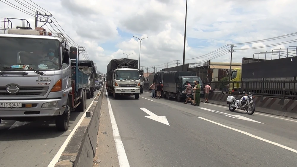 Trưa nay, 1-9, dòng xe đang lưu thông trên quốc lộ 1A hướng về miền Tây. Khi đến dốc cầu Bình Thuận (quận Bình Tân, TP.HCM) do không giữ khoảng cách an toàn bốn xe tải tông liên tiếp vào nhau.