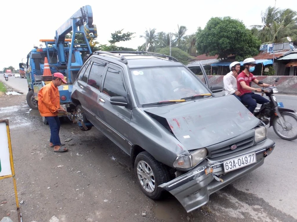 Khi xe này đi đến gần dốc cầu Rượu đoạn thuộc địa phận xã Thạnh Phú, huyện Châu Thành (Tiền Giang) thì phải dừng lại do có chướng ngại vật phía trước. Xe bốn chỗ 63A-049.77 lưu thông phía sau cũng phải dừng theo.