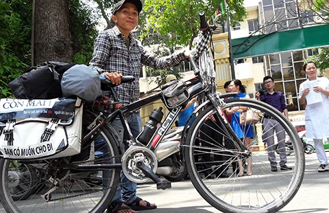 Gần 40 ngày Khương đạp xe qua 27 tỉnh, thành để vận động hiến tạng. Ảnh: GIANG LINH