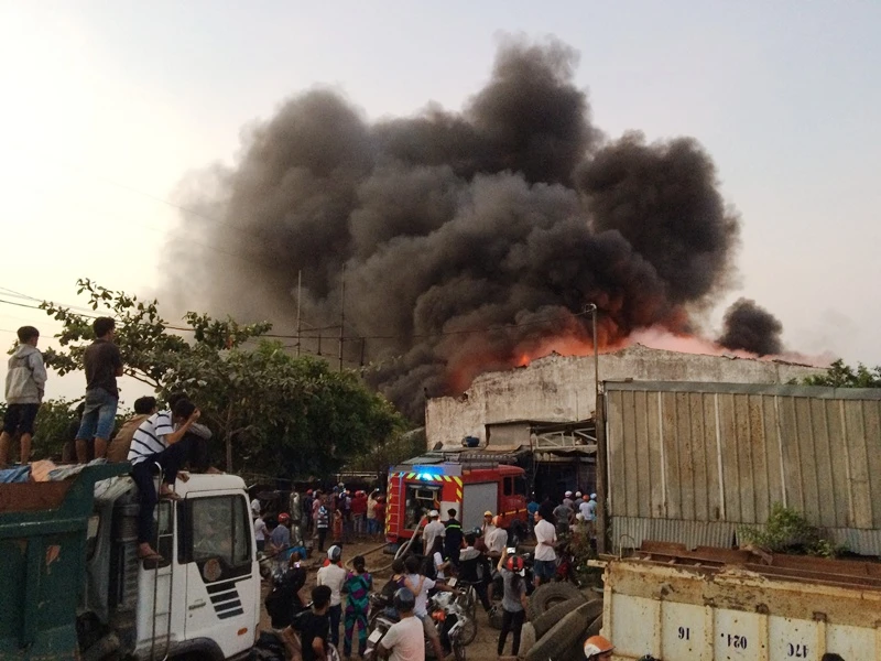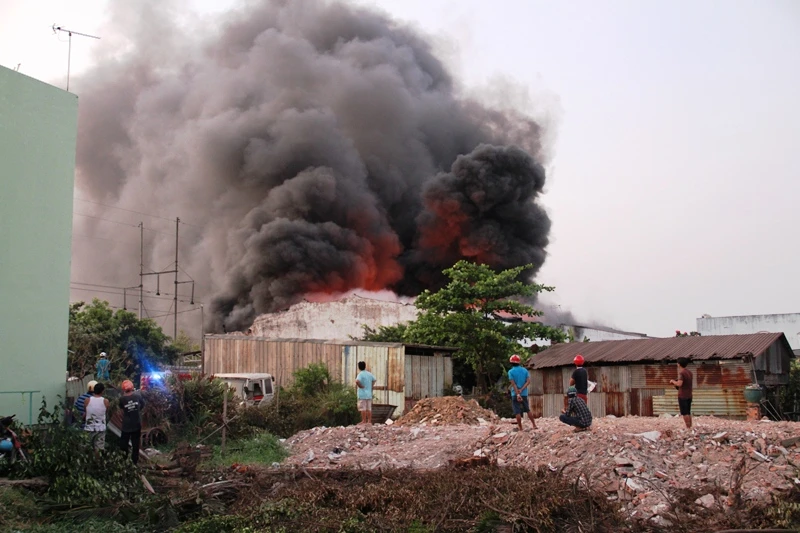 Khói lửa bốc cao trong vụ cháy lớn tại nhà kho của hai công ty ở quận Bình Tân