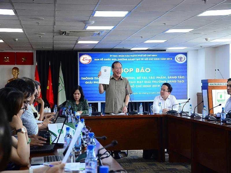 Ông Huỳnh Công Hùng công bố biểu trưng (logo) của giải thưởng Sáng tạo TP.HCM và thông tin về buổi trao giải thưởng. Ảnh: H.LAN
