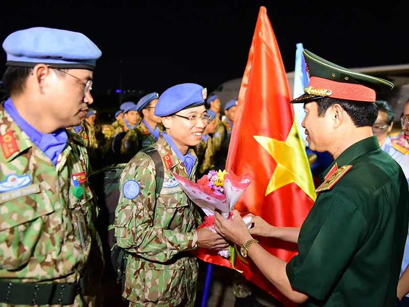 Trung tướng Nguyễn Tân Cương, Phó Tổng Tham mưu trưởng Quân đội nhân dân Việt Nam, tặng hoa chúc mừng các y, bác sĩ Bệnh viện dã chiến cấp 2 số 1 trở về sau một năm làm nhiệm vụ tại Nam Sudan. Ảnh: THANH TÙNG