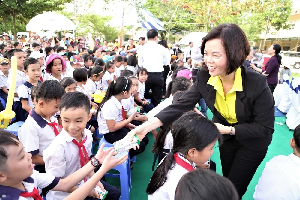 Bà Bùi Thị Hương, Giám đốc Điều hành Vinamilk trao sữa cho các em học sinh.