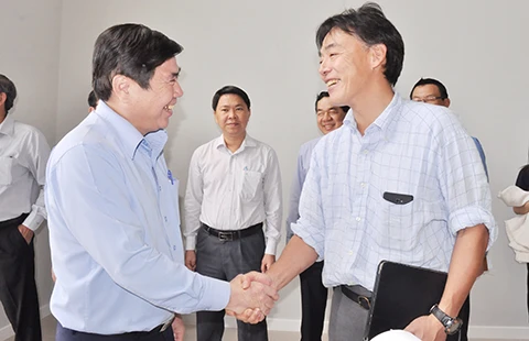Chủ tịch UBND TP.HCM Nguyễn Thành Phong trao đổi với ông Mori Mutsaya, đại diện Văn phòng JICA Việt Nam Ảnh: THANH XUÂN